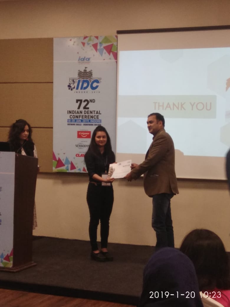 Due to the encouragement received from Dr. Fernando Noronha, I was able to give a presentation in front of a big crowd of dentists and judges. Initially I was scared and nervous with all butterflies in my stomach till I went on the dais. But all’s well that ends well… ended my presentation with a loud applause from the audience and appreciation from the judges and was also awarded with a certificate. It was a moment that I will cherish throughout my life.